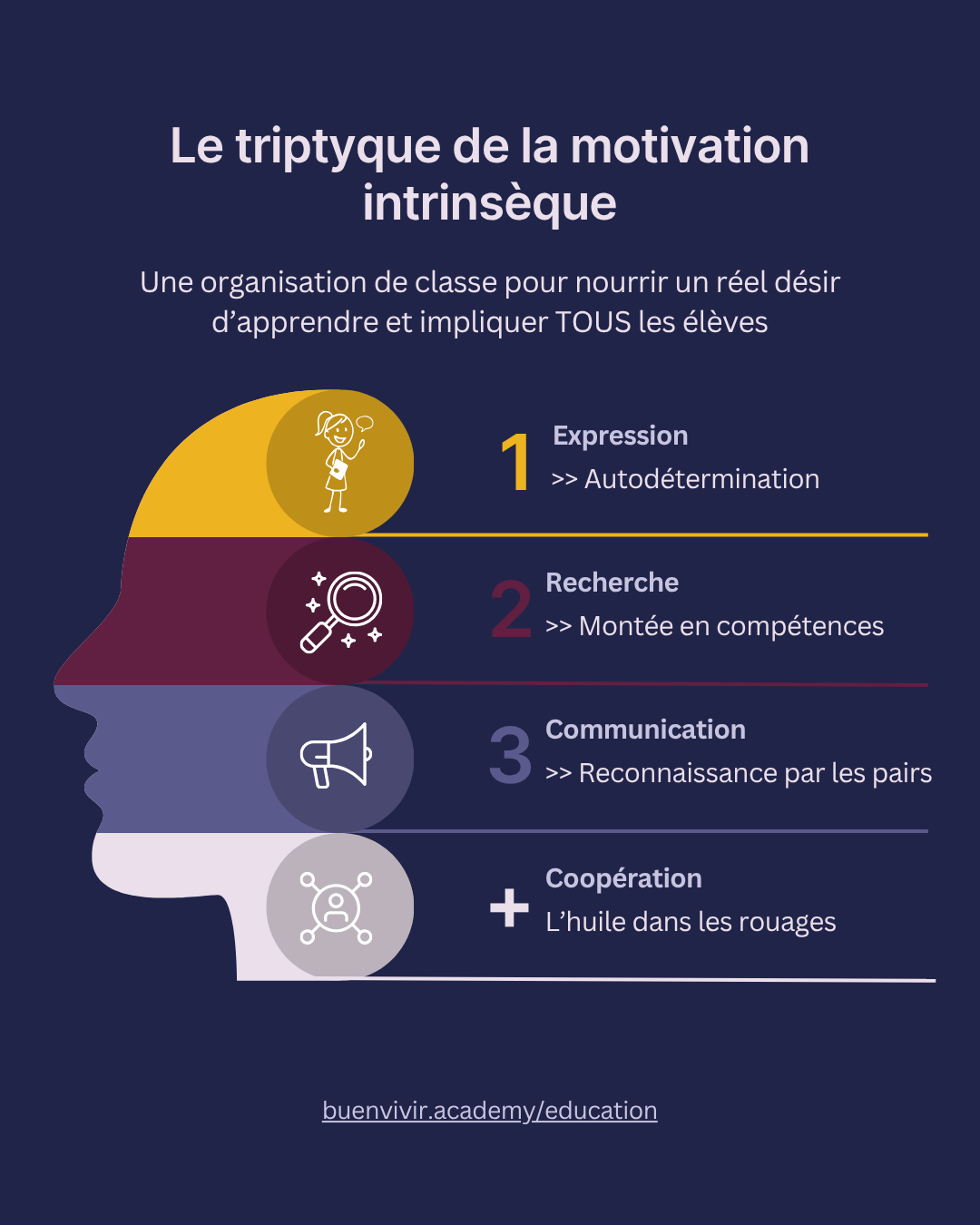 Ces trois types d'activités répondent aux besoins psychologiques fondamentaux de la motivation intrinsèque — autodétermination, montée en compétences, reconnaissance par les pairs — tandis que la coopération joue le rôle d’"huile dans les rouages".
